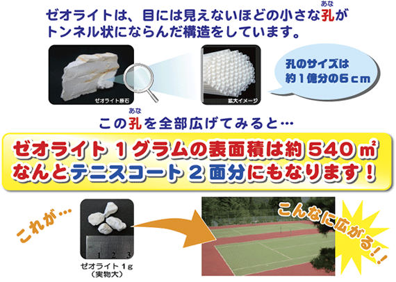 拡大してみると、1億分の6cmという非常に小さな孔(あな)がトンネル状に並んだ構造をしているので、水や化学物質、臭いなどを分子サイズで吸着します。